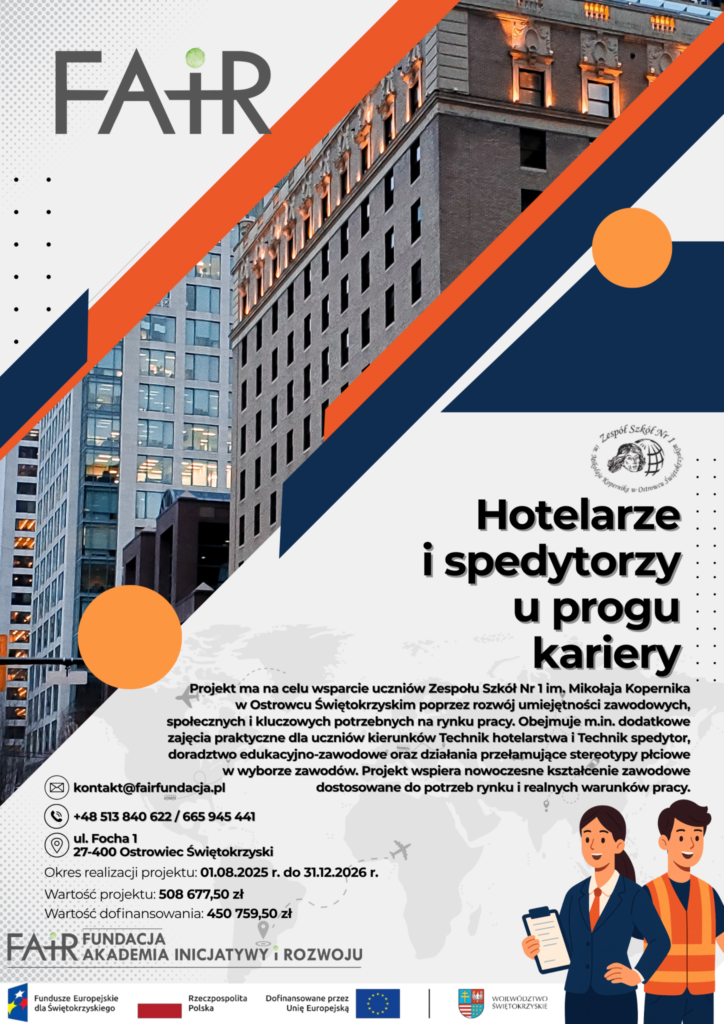 Projekt ma na celu wsparcie uczniów Zespołu Szkół Nr 1 im. Mikołaja Kopernika w Ostrowcu Świętokrzyskim poprzez rozwój umiejętności zawodowych, społecznych i kluczowych potrzebnych na rynku pracy. Obejmuje m.in. dodatkowe zajęcia praktyczne dla uczniów kierunków Technik hotelarstwa i Technik spedytor, doradztwo edukacyjno-zawodowe oraz działania przełamujące stereotypy płciowe w wyborze zawodów. Projekt wspiera nowoczesne kształcenie zawodowe dostosowane do potrzeb rynku i realnych warunków pracy.