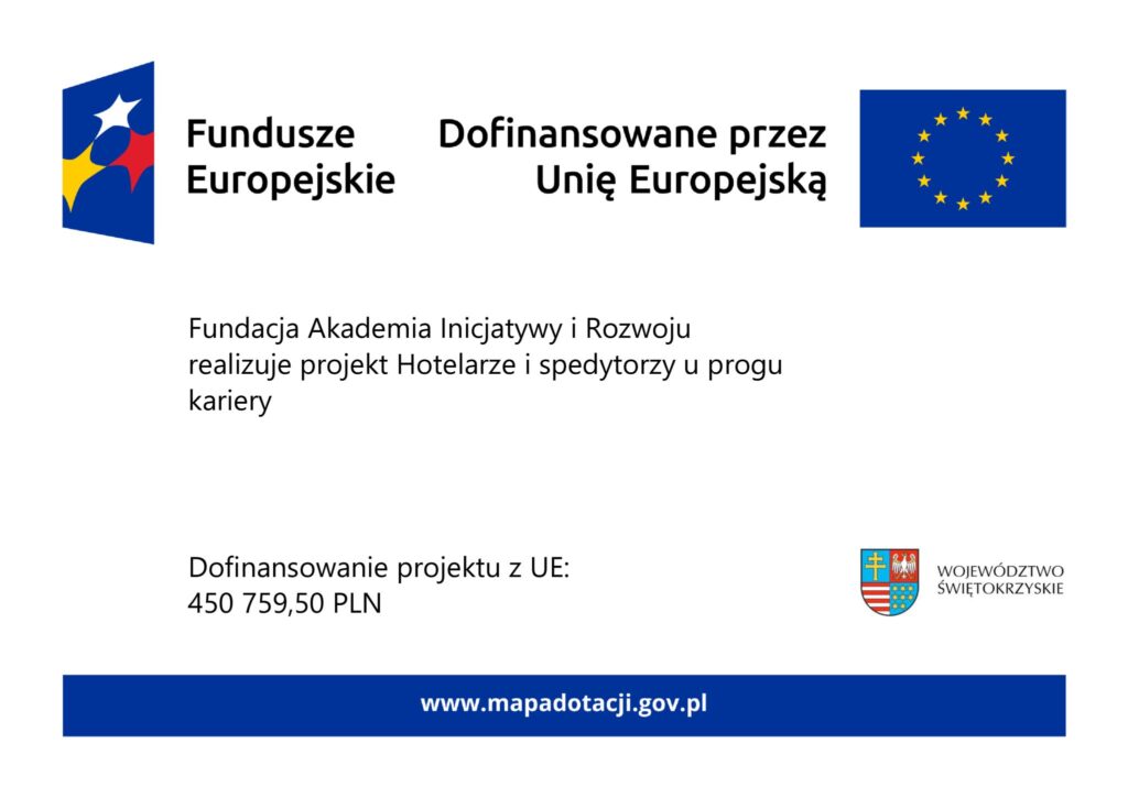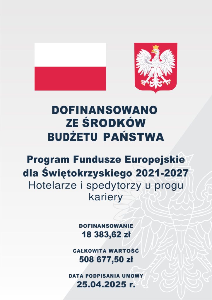 Projekt Hotelarze i spedytorzy u progu kariery został współfinansowany ze środków Unii Europejskiej w ramach programu Fundusze Europejskie dla Świętokrzyskiego 2021–2027 oraz z budżetu państwa.